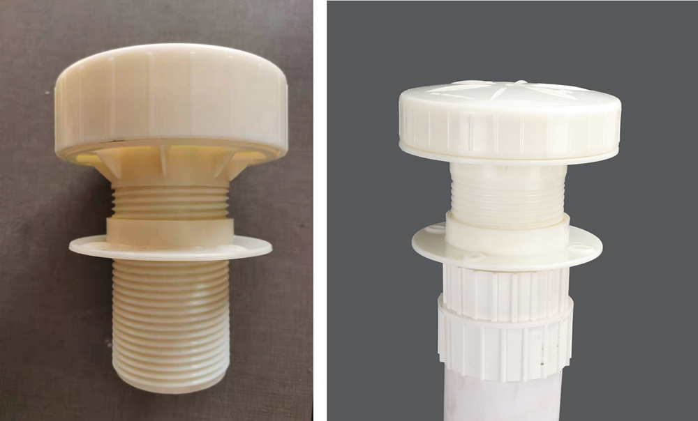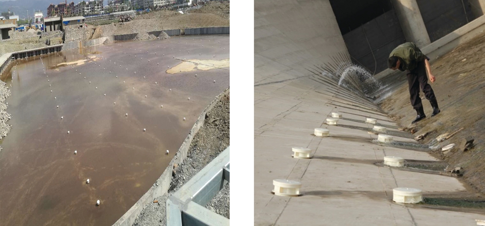 當(dāng)防滲膜上下的水頭差達到2cm~10cm時,逆止閥的蓋板受到水壓后在然力作用下開啟,起到單向排水孔的功能,受制動頂蓋及彈簧的作用,壓力水改變了原水流的方向,揚壓力水向外、向下排出,降低滲透水壓力。當(dāng)防滲膜內(nèi)外水平衡時,蓋板關(guān)閉防止渠水回流,實現(xiàn)了單向通水。又因,壓力水向下排出,沖洗排水口,解決微生物、泥沙堵塞出水口的問題。